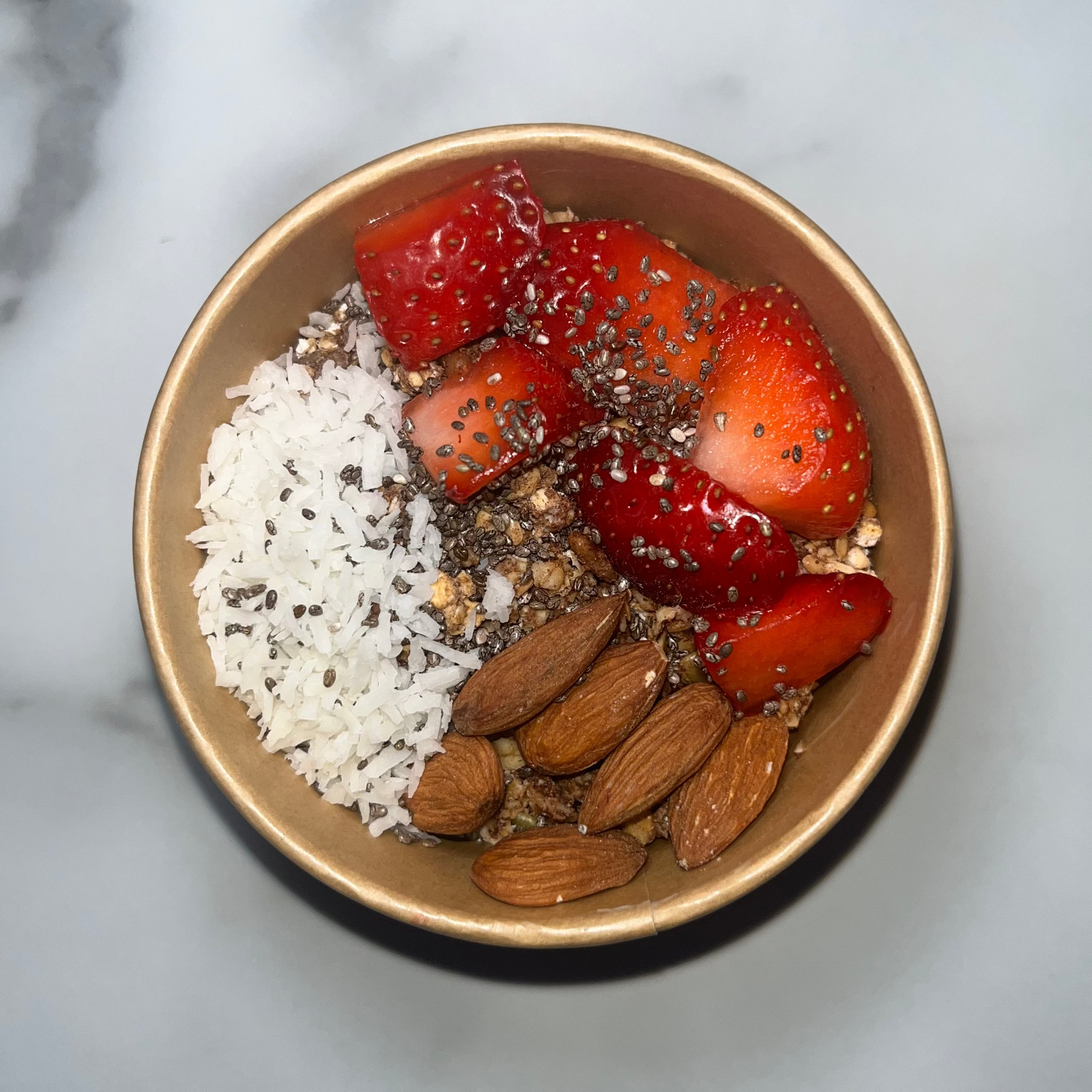 Greek Yogurt(Milk), Oats, Sunflower Seeds, Pumpkin Seeds, Flaxseeds, Banana, Coconut Oil, Honey, Cinnamon, Salt, Strawberries, Almonds, Chia Seeds and Desicated Coconut.