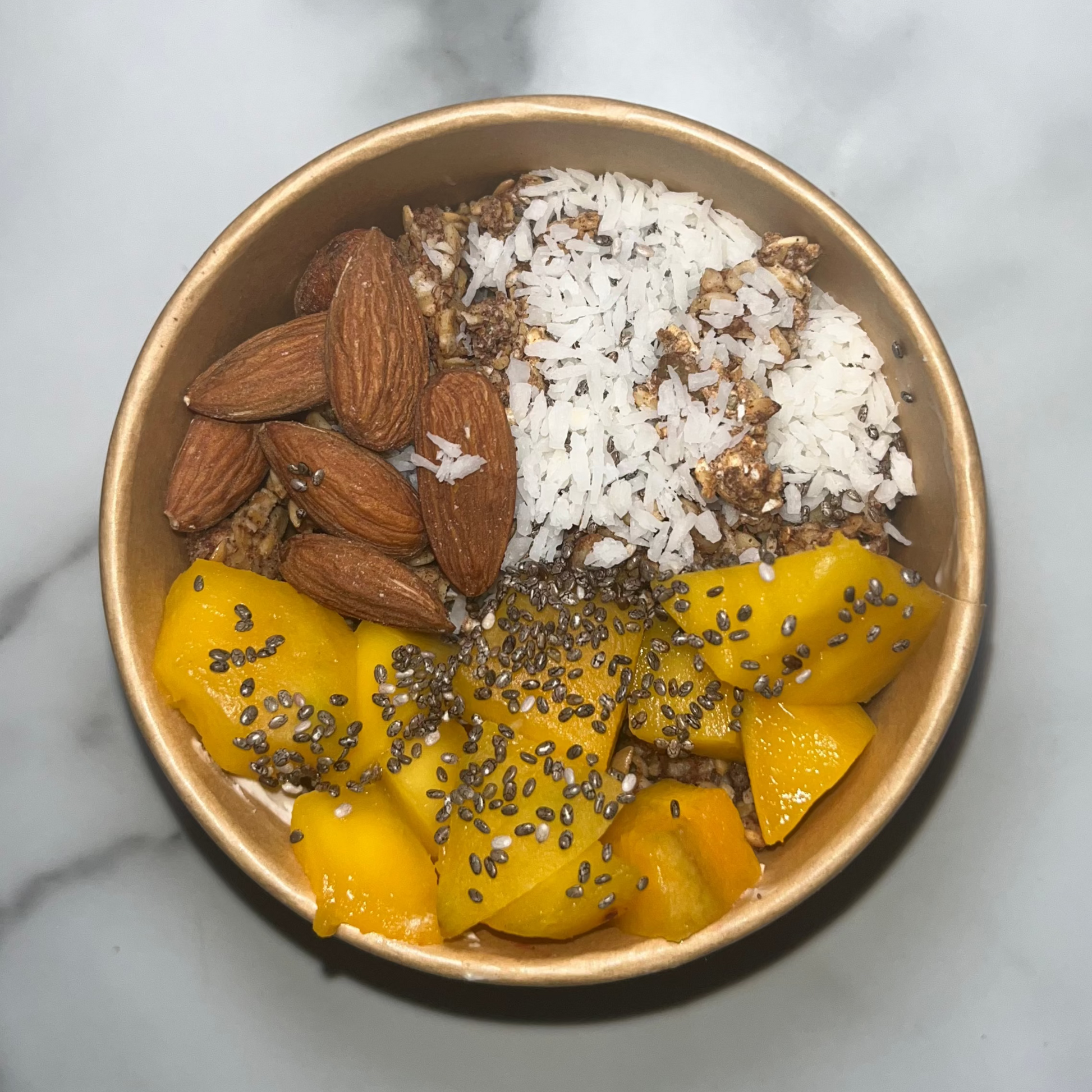 Greek Yogurt(Milk), Oats, Sunflower Seeds, Pumpkin Seeds, Flaxseeds, Banana, Coconut Oil, Honey, Cinnamon, Salt, Mango, Almonds, Chia Seeds and Desicated Coconut.