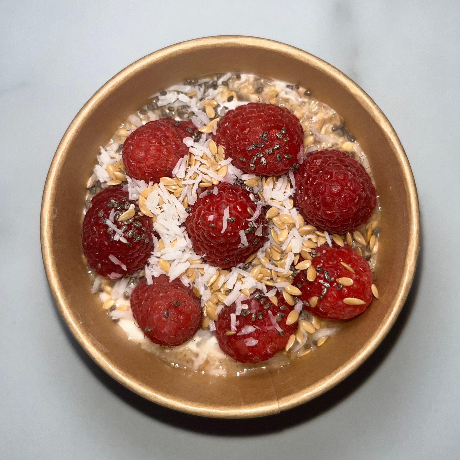 Oats, Milk, Banana, Flax Seed, Cinnamon, Greek Yoghurt(Milk), Raspberries, Chia Seeds and Desicated Coconut.